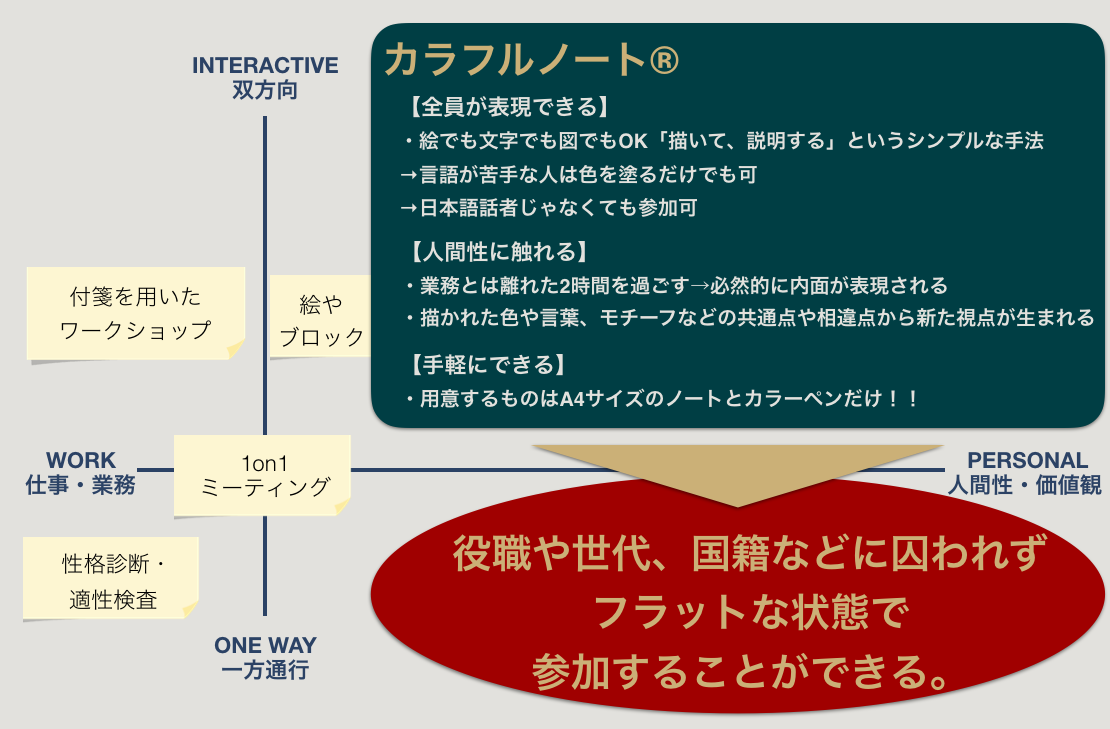 カラフルノート®では、言語と非言語のコミュニケーションを繰り返すため、既存の手法とは異なったスタイルの組織開発が可能となります。
